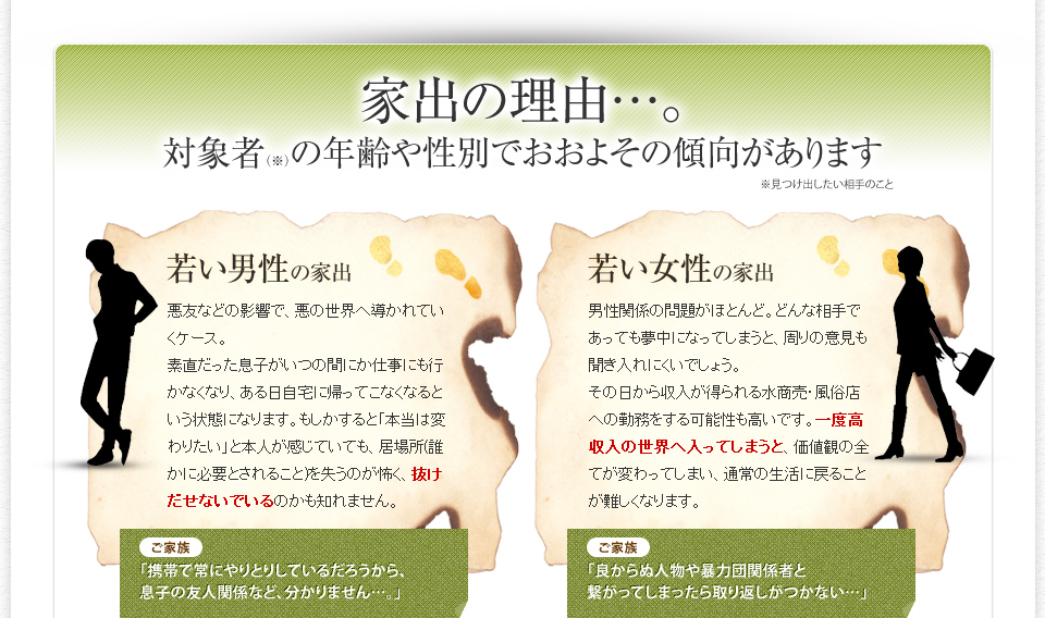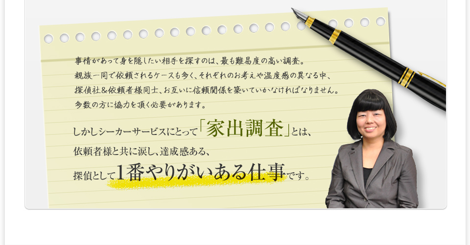 家出は妹が仕事を退職した直後だったので、環境が変わったのを契機に男性の元へ行った可能性が高く、男性の情報も整理し、現在の住所を判明させました。