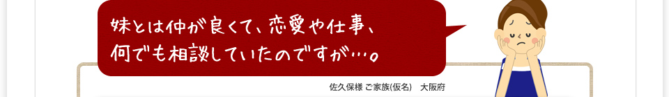 依頼者は佐久保様ご家族(ご両親+姉)。お姉さまと妹(対象者)は仲のいい姉妹で恋愛、仕事のこと何でも相談していました。